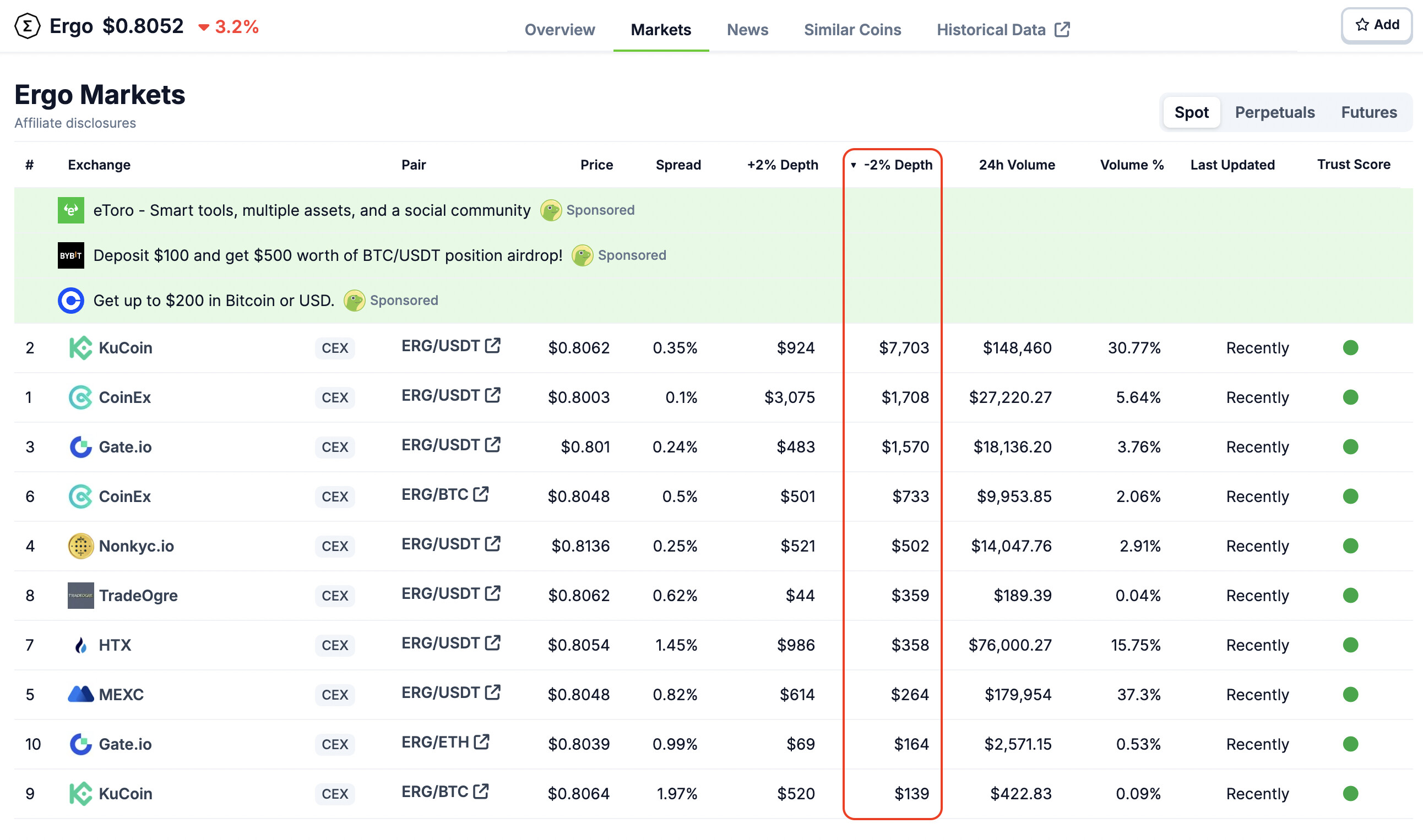 Relying on centralized exchanges for liquidity presents multiple risks: the CEX could experience downtime or even pause withdrawals during periods of high volatility (this occurs even with tier 1 exchanges such as Coinbase and Binance) and the shallow depth of CEX orderbooks for most CNTs places substantial risk on the Liqwid protocol and its liquidators.