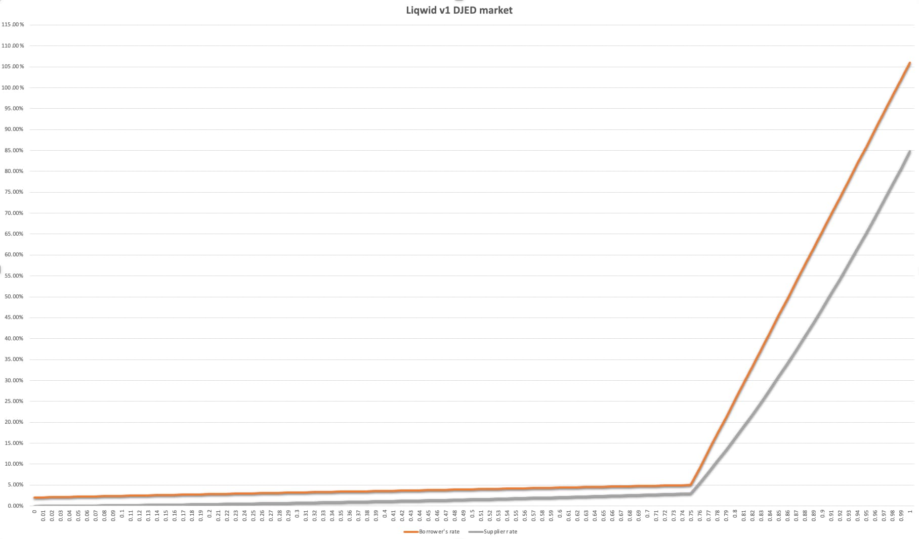 The interest rate curve below highlights the current kink point for the DJED market, implemented at 75% (ADA market also has a 75% kink point)
